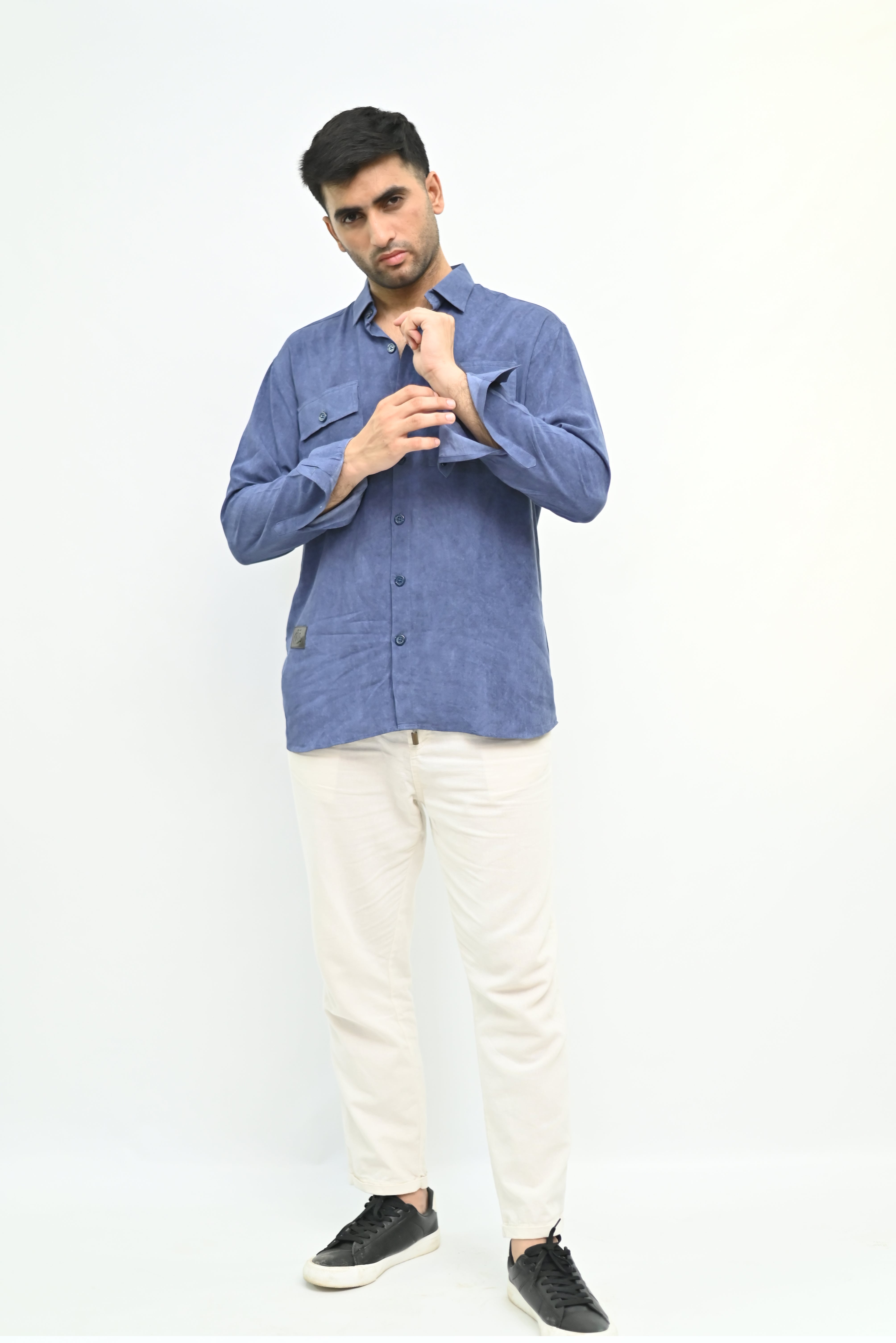 Neher, named after the flow of rivers, reflects calm strength and understated elegance. This moonlight blue shirt is designed for the modern man who values minimal yet refined tailoring. The highlight of Neher is its folded strip detail across the chest, paired with a clean silhouette and a subtle leather Manam logo patch — making it a distinctive yet versatile piece.
